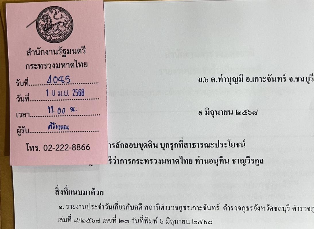 ชาวบ้านท่าบุญมี อ.เกาะจันทร์ ชลบุรี ร้อง อนุทิน ชาญวีรกูล คนในสังกัดมหาดไทยลักขโมยดินหลวงขาย รองนายก อบต.ท่าบุญมี สั่งนิติกรแจ้งความหาคนผิดมาลงโทษ