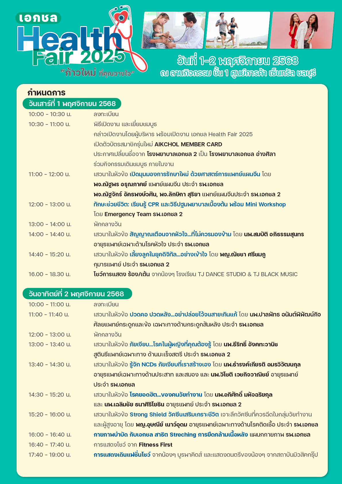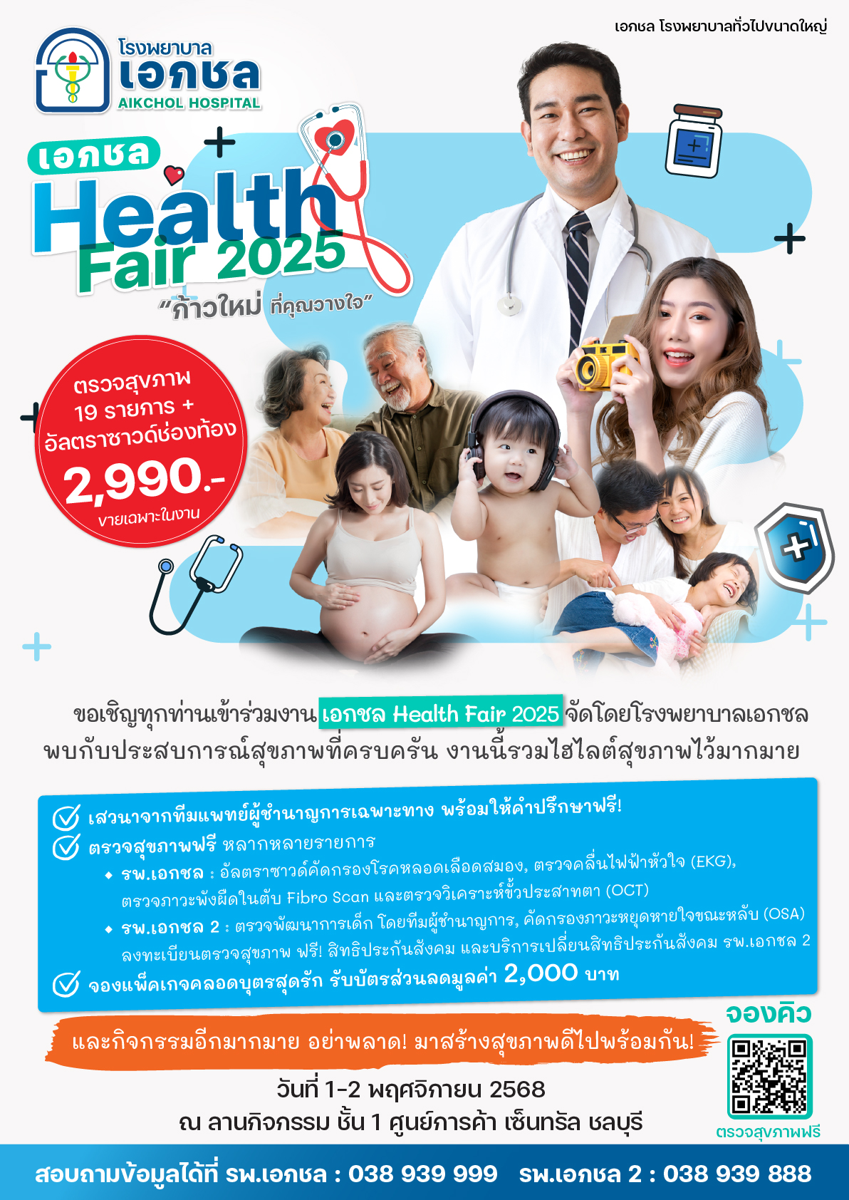 ในวันที่ 1-2 พฤศจิกายน 2568 เครือโรงพยาบาลเอกชล (มหาชน) ได้จัดงานมหกรรมเพื่อสุขภาพ : AIKCHOL HEALTH FAIR 2025 ณ ลานกิจกรรม ชั้น 1 เซ็นทรัล ชลบุรี โดยยกทัพทีมแพทย์ พยาบาล บุคลากรทางการแพทย์ และเจ้าหน้าที่ ลงพื้นที่ให้บริการตรวจสุขภาพ (ไม่มีค่าใช้จ่าย) อาทิเช่น การตรวจพัฒนาการเด็ก, การตรวจคลื่นไฟฟ้าหัวใจ (EKG), การตรวจภาวะไขมันพอกตับ (Fibro Scan), การตรวจวัดความดันลูกตาด้วยเครื่อง OCT, การตรวจอัลตราซาวด์คัดกรองหลอดเลือดสมอง, คัดกรองภาวะหยุดหายใจขณะหลับ, ลงทะเบียนตรวจสุขภาพฟรี! สิทธิประกันสังคม, ลงทะเบียนเปลี่ยนสถานพยาบาลสิทธิประกันสังคม เลือก รพ.เอกชล 2 และอื่นๆ อีกมากมาย พร้อมพบกับแพ็คเกจตรวจสุขภาพส่วนลดสูงสุด 70% โปรโมชั่นวัคซีนสำหรับเด็กและผู้ใหญ่ ในราคาสุดพิเศษ เฉพาะงานนี้เท่านั้น