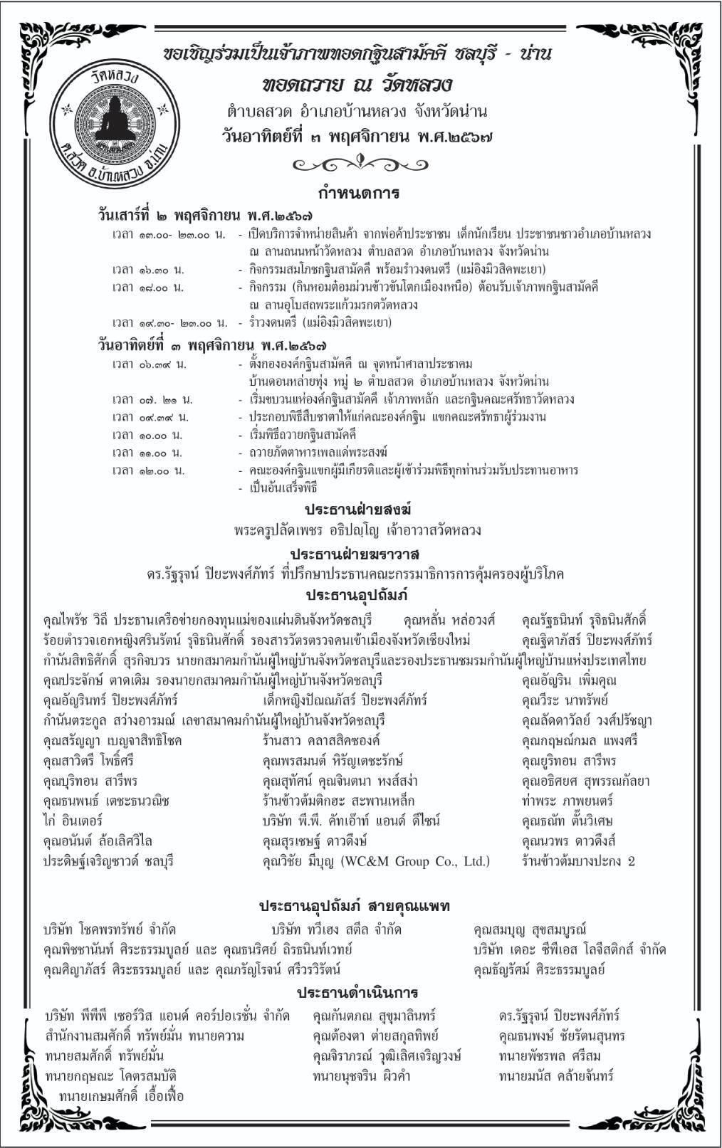 เมื่อวันที่ 23 ตุลาคม ดร.รัฐรุจน์ ปิยะพงศ์ภัทร์ ที่ปรึกษาประธานคณะกรรมาธิการ การคุ้มครองผู้บริโภค สภาผู้แทนราษฎร เปิดเผยว่า ตนได้ร่วมกับญาติสนิทมิตรสหาย พุทธศาสนิกชน จะทอดกฐินสามัคคี ณ วัดหลวง ต.สวด อ.บ้านหลวง จ.น่าน ในวันอาทิตย์ที่ 3 พฤศจิกายน 2567 โดยมีพระครูปลัดเพชร อธิปญฺโญ เจ้าอาวาสวัดหลวง เป็นประธานฝ่ายสงฆ์ สำหรับเงินรายได้จะนำไป สร้างศาลาอเนกประสงค์ พิพิธภัณฑ์ ร.9 เพื่อเป็นการปลูกจิตสำนึกให้กับประชาชนในพื้นที่ ได้ระลึกถึงแนวทางในการพัฒนาของพ่อหลวง ร.9.