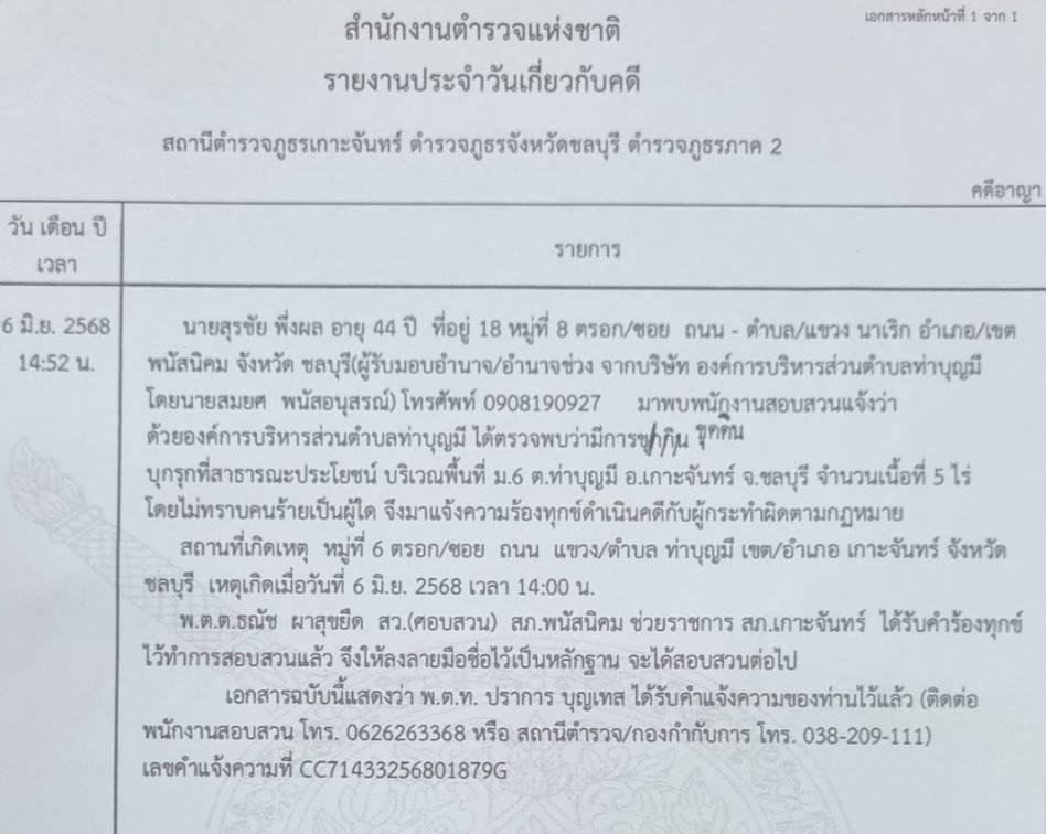 ชาวบ้านท่าบุญมี อ.เกาะจันทร์ ชลบุรี ร้อง อนุทิน ชาญวีรกูล คนในสังกัดมหาดไทยลักขโมยดินหลวงขาย รองนายก อบต.ท่าบุญมี สั่งนิติกรแจ้งความหาคนผิดมาลงโทษ